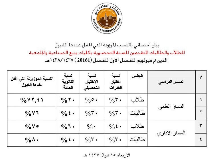 أصدقاء ينبع الصناعية V Twitter الجدول يوضح النسب الموزونة التي أقفل عندها القبول الترم الماضي للطلاب والطالبات المتقدمين للسنة التحضيرية بكليات ينبع الصناعية والجامعية Https T Co Wugbg9em7n