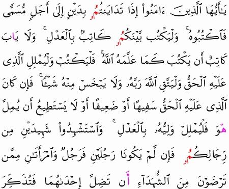 ي ا أ ي ه ا ال ذ ين آم ن وا إ ذ ا ت د اي ن ت م ب د ي ن إ ل ى أ ج ل م س م ى ف اك ت ب وه و ل ي ك ت ب ب ي ن ك م ك ات ب ب ال ع د ل و ل ا ي أ ب ك ات ب أ ن ي ك ت ب ك م ا ع ل م ه الل ه ف ل ي ك ت ب و ل ي م ل ل ال ذ ي ع ل ي ه ال ح ق